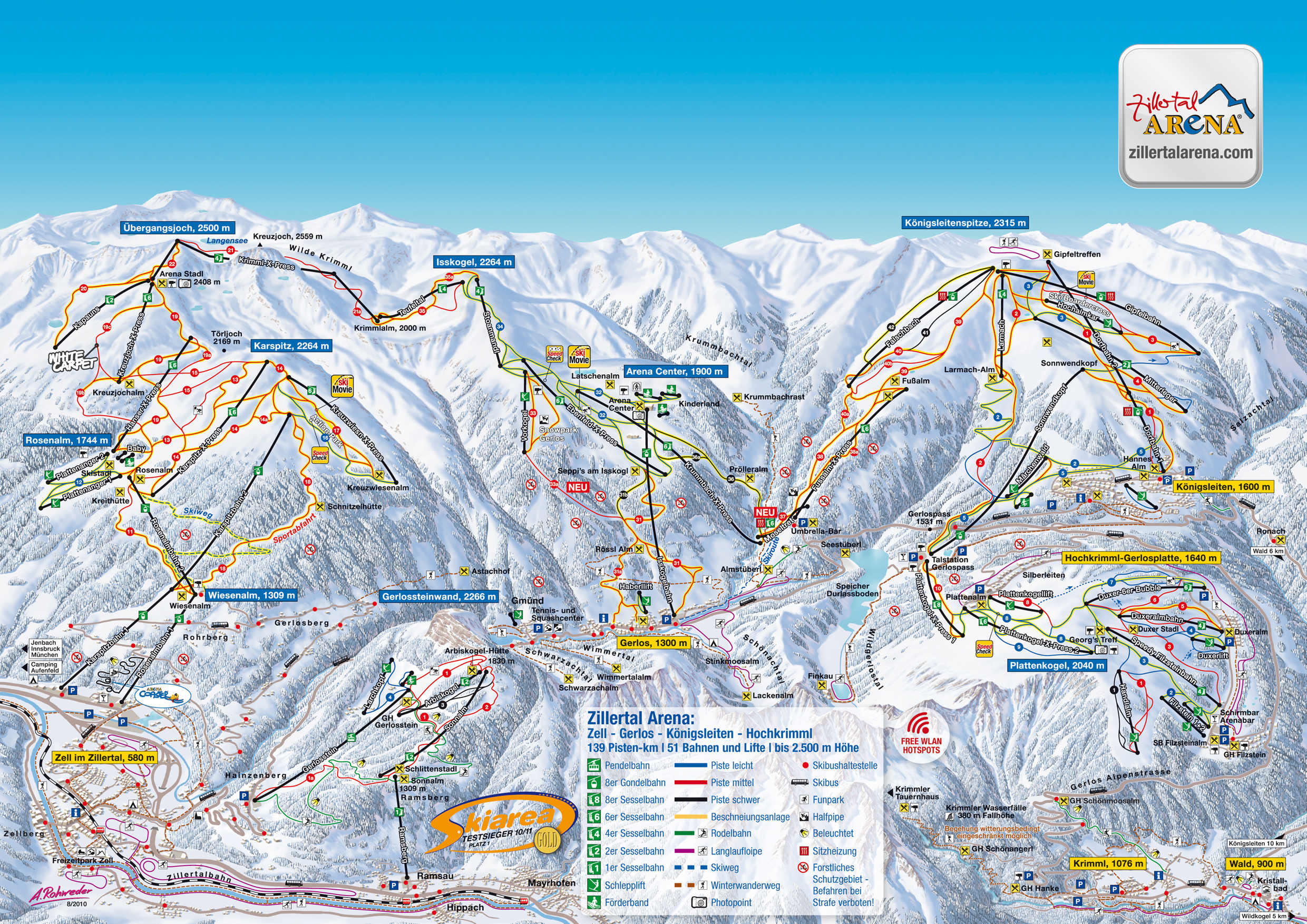Hintertuxer GletscherHöhe: 1500 m - 3250 m Pisten: 86 km Skilifte: 21 Pistenplan: Hintertuxer Gletscher Schneesicherheit alle Gebiete: Dezember bis April Gletscher: ganzjähriger Skilaufbetrieb Langlauf 200 km gespurte Loipen Pistenplan Zillertal Gesamtansicht Das Zillertal bietet eine Ansammlung von zehn kleinen und mittelgroßen Skigebieten mit insgesamt über 600 Pistenkilometern. Durch neue Verbindungslifte sind verschiedene Skischaukeln entstanden, die ein großräumiges "Ski-Cruising " ermöglichen. Ein lückenloser, kostenfreier Skibusservice sorgt für eine sehr gute Verknüpfung dieser Teilregionen. Der ADAC vergibt maximale 5 Sterne und das Prädikat "garantiert schneesicher". Skipass
